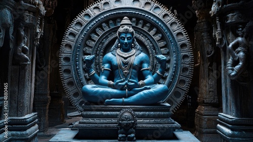 Fototapeta premium The deity Lord Vishnu is depicted seated on a pedestal, surrounded by...