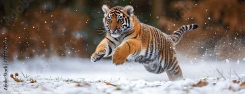 © Landscape Planet, Fototapeta premium The Delightful Dash of a Tiger Cub Across a Snow-Covered Field, Embodying the Joy of Winter's Touch.