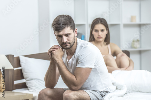 © realstock1, Fototapeta premium The depressed man sit near the woman in the bed