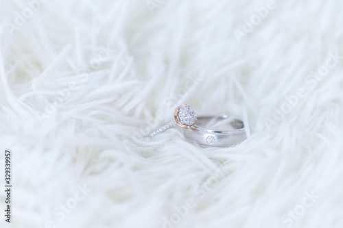 Obraz premium The diamond wedding ring for the bride and groom's wedding ring is made of white gold. And large high-value diamonds lay on the woolen rug Concept of important, wedding day celebration
