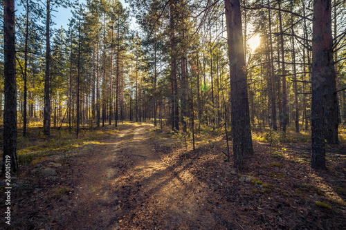 © Evgesha, Fototapeta premium The dirt road in the wild remote forest, lit with sunlight, Mari El, Russia
