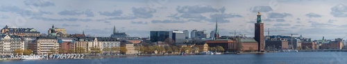 © Hans Baath, Fototapeta premium The district Kungsholmen, the City Hall, and down town at the bay Riddarfjärden, a sunny spring day in Stockholm