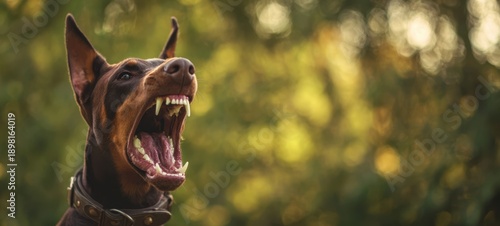 © Studio Nova, Naklejka premium The Doberman Showing Aggressive Snarling Expression With Exposed Teeth Outdoors in Park