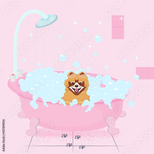 © Anastasiia, Fototapeta premium The dog in the bath bathes, grooming for animals.
