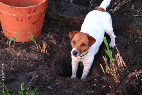 © jarizPJ, Fototapeta premium The dog in the yard is digging a hole. Pies na podwórku kopie dziurę.
