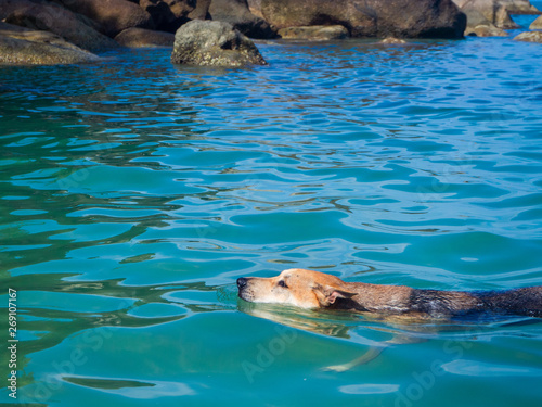 © alexkazachok, Fototapeta premium The dog is looking for something in the water. Koh Phangan. Thailand
