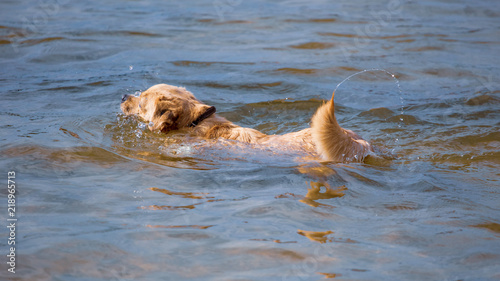 © schankz, Obraz premium The dog is swimming on the water in the lake