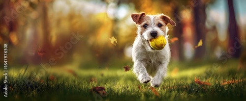 © Studio Nova, Fototapeta premium The dog joyfully running through autumn park with a yellow tennis ball in mouth