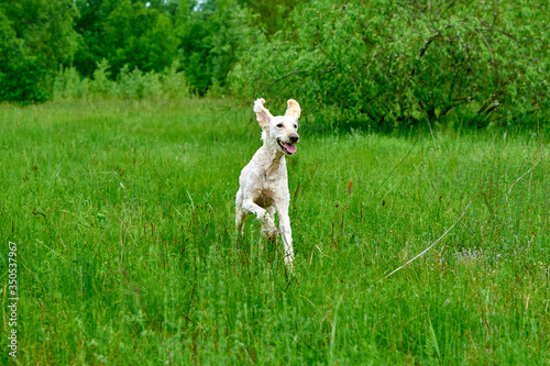 Obraz premium The dog runs on the green grass. A large royal poodle will develop on the lawn.