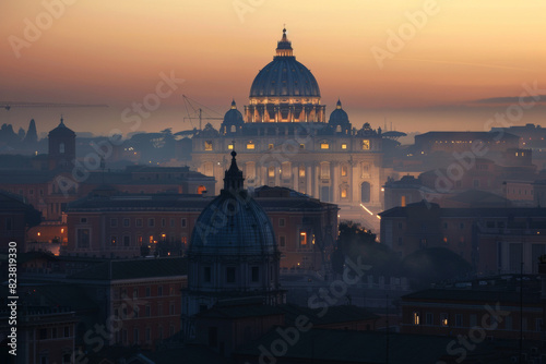 Fototapeta premium The dome of St. Peter's Basilica emerges gradually on the horizon, bathed in a soft morning glow. The Vatican City takes on a tranquil atmosphere