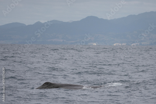 Obraz premium The dorsal fin of a sperm whale becomes visible just before it dives into the...