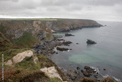 © Migara, Obraz premium The dramatic coast along Cornwall viewed from a coastal walk at the edge of the cliffs.