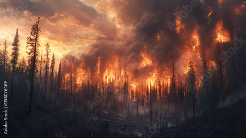 © Thiago, Fototapeta premium The dramatic consequences of wildfires on a once-green forest. Frostflare. Illustration
