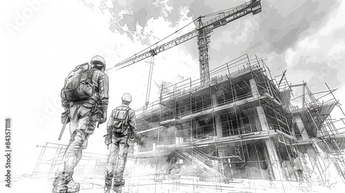 © Pattarin, Obraz premium The drawing shows construction and there are construction workers and engineers in the area at the construction site illustration vector