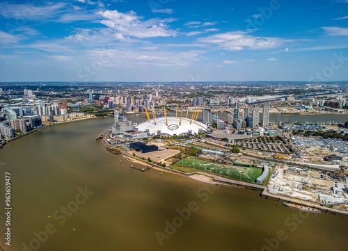 Obraz premium The drone aerial view of Greenwich Peninsula and River Thames. The Greenwich...