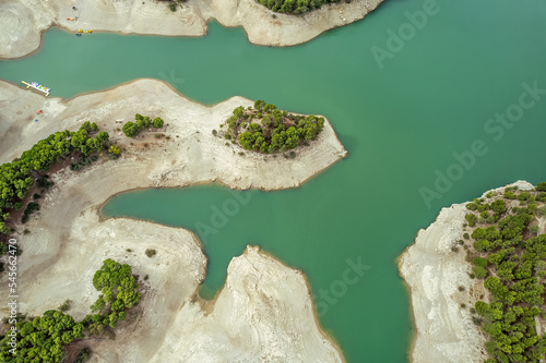 © yujie, Naklejka premium The drone aerial view of Guadalhorce reservoir in the mountains of Andalusia in southern Spain in summer.