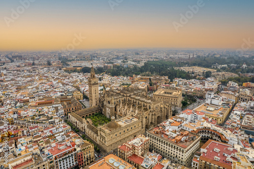 Fototapeta premium The drone aerial view of Seville Cathedral (Catedral de Santa Maria de la Sede de Sevilla) at sunrise, Seville, Spain.