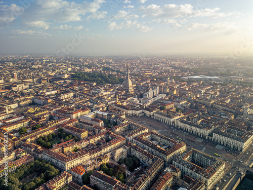 Fototapeta premium The drone aerial view of Turin city centre with Mole Antonelliana at sunrise, Piedmont region of Italy.