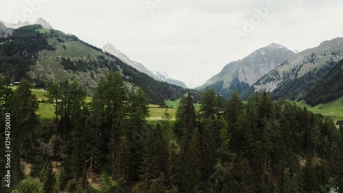 Fototapeta premium The drone rises from behind the trees, revealing beautiful panoramic view of high mountain valley with a village in the lowland. The peaks of the rocky Alpine mountains are covered with snow. Austria