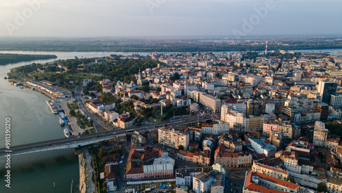 © Nenad, Fototapeta premium The drone view of the historical downtown center of Belgrade at sunset.