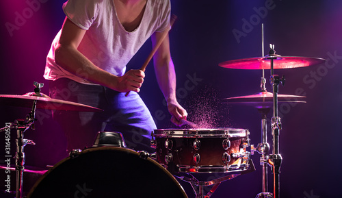 Fototapeta premium The drummer plays the drums. Beautiful blue and red background, with rays of light. Beautiful special effects smoke and lighting. The process of playing a musical instrument. Close-up photo.
