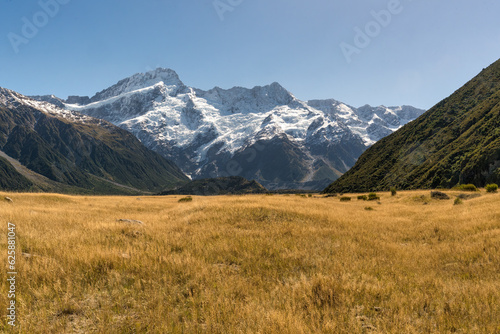 Fototapeta premium The dry Tasman valley near the Mt cook village with a backdrop of the snow covered Southern alps