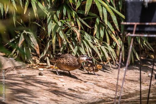 © Valentin, Fototapeta premium The duck with ducklings swims in the evening in the lake