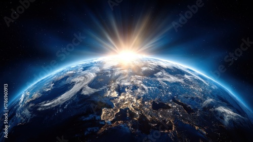 © Dara, Obraz premium The Earth, a blue planet with a glowing sun and a starry sky, is depicted from space, showcasing its vast surface and the illuminated cities below.