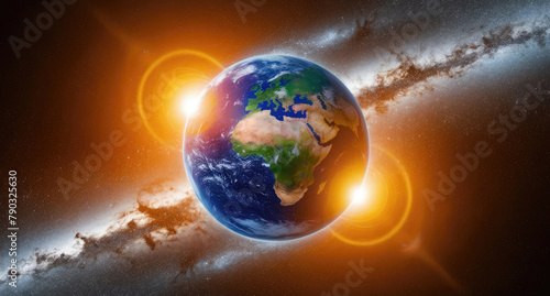 Fototapeta premium The Earth floating in a fantasy space galaxy, and celestial bodies shimmer in...