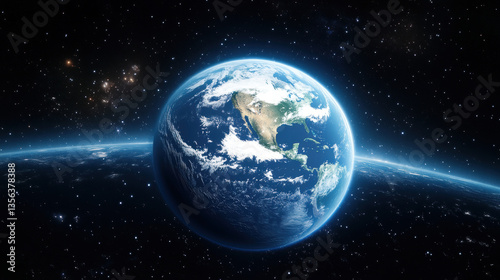 Fototapeta premium The Earth in space, glowing blue and white, with stars in the background