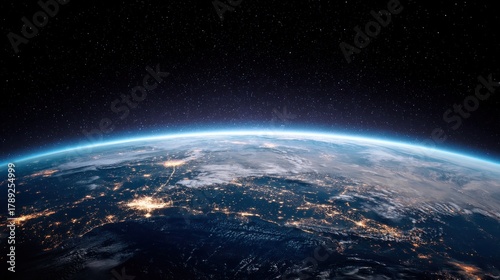 © SOEM, Obraz premium The Earth's horizon with a blue glow and distant stars, viewed from space.