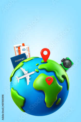 © tovovan, Fototapeta premium The Earth with pins, aircraft, tickets, passport and digital camera. 3d vector banner with copyspace