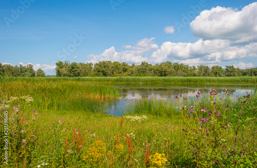 © Naj, Fototapeta premium The edge of a pond with reed in a green grassy field below a cloudy blue sky in sunlight in summer
