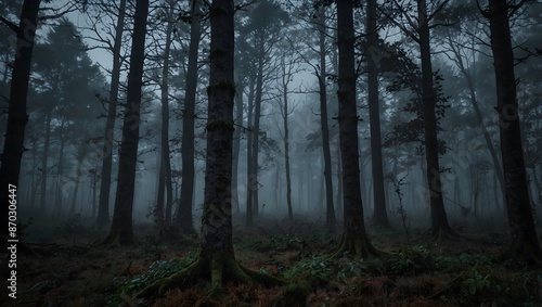 Naklejka premium The eerie beauty of a misty forest at dusk ai_generated