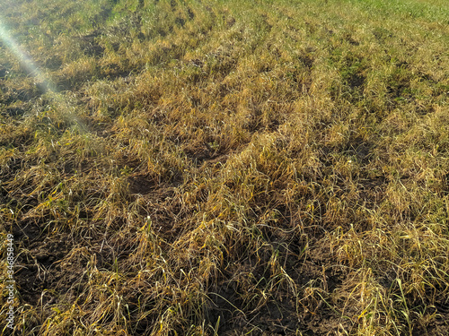 Fototapeta premium the effects of drought. dried wheat or barley plants on a farm field.