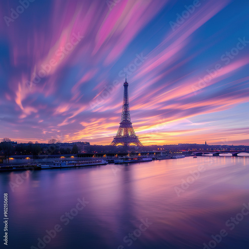 Fototapeta premium The Eiffel Tower by the Seine River at sunset