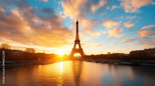 Fototapeta premium The Eiffel Tower in Paris is illuminated against a brilliant sunset with vibrant clouds, reflected in the calm waters below, offering a splendid urban landscape view.