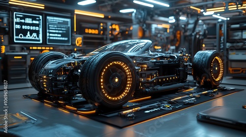 Fototapeta premium The electric vehicle industry is showcased through a futuristic user interface, combining advanced technology with repair services in a digitally enhanced garage environment.