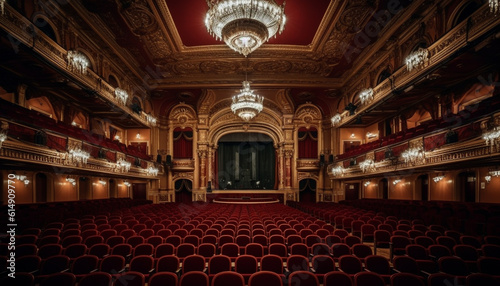 © Stockgiu, Obraz premium The elegant auditorium velvet chairs were illuminated for the performance generated by AI