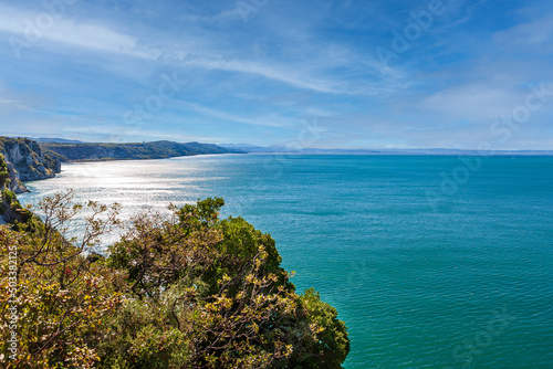 © Sergey, Obraz premium The emerald-colored Adriatic Sea near Duino, Gulf of Trieste, Italy. Light wind