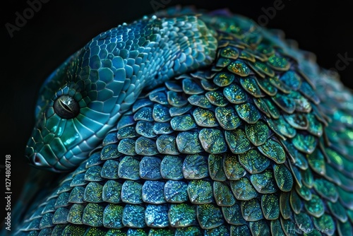 © Helen-HD, Fototapeta premium The emerald displays a captivating close-up of its head and body, revealing iridescent scales that shimmer in an array of green and blue tones, highlighting natural beauty