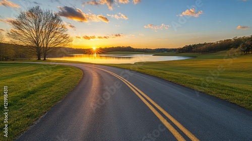 © angga, Naklejka premium The empty road leading to the lake by sunset