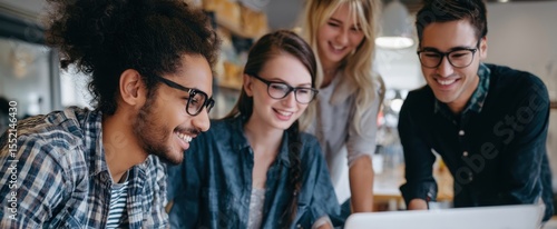 © Marta B, Obraz premium The engaged group collaborating over a laptop in a modern workspace.