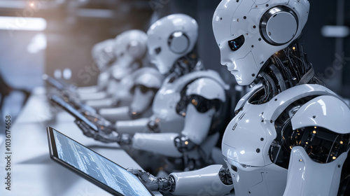 © ImageKing, Fototapeta premium The engineer manages robots using a tablet, controlling them with software and connecting to a network. The robots are automated and powered by artificial intelligence.