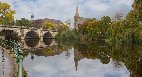 © © Raymond Orton, Naklejka premium The English Bridge across the River Severn with United Reformed Church to the right hand side, Shrewsbury, Shropshire, England