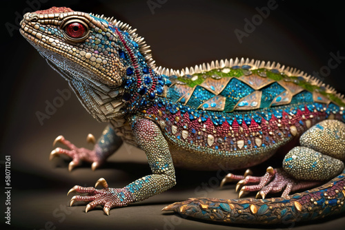 © Czintos Ödön, Obraz premium The entire figure of the desert lizard covered with rubies, emeralds, diamonds and pearls. Ornate celebratory clothing against a dark background. Unreal representation. AI generated illustration.