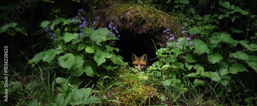 Obraz premium The entrance of a fox den invites quiet curiosity amidst gentle natural...