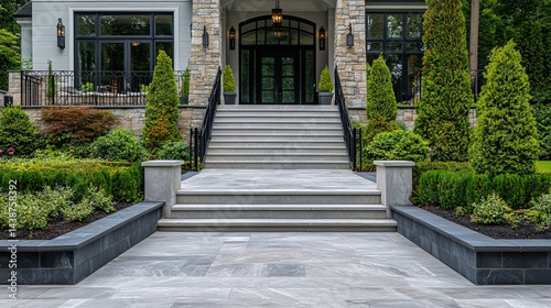 © Turab, Fototapeta premium The entrance of a luxury home in Vancouver, painted grey, with stair steps and beautiful landscaping, on a sunny day in June 2024.