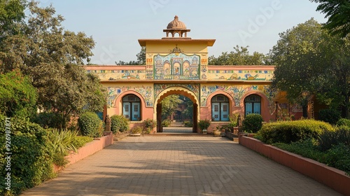 Obraz premium The entrance of an Indian school building, with traditional architecture, colorful murals, and well-maintained gardens, capturing the welcoming atmosphere.
