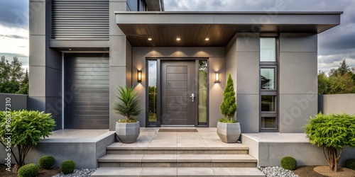 Obraz premium The entrance to the modern house is defined by a sleek gray door, adorned...